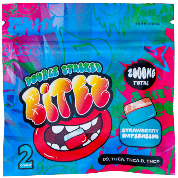 Experience the delightful blend of flavors with our latest Double-Stacked BITEZ gummies! These artisanal treats combine the rich sweetness of strawberries with the lush taste of watermelon, all in one scrumptious gummy. Each gummy is expertly infused with a robust mix of THCA, THCA-B, Delta-9, and THCP, delivering a total of 1,000mg per piece. Every pack comes with two of these exceptional, multi-layered delights, promising a deeply satisfying taste adventure with every bite.